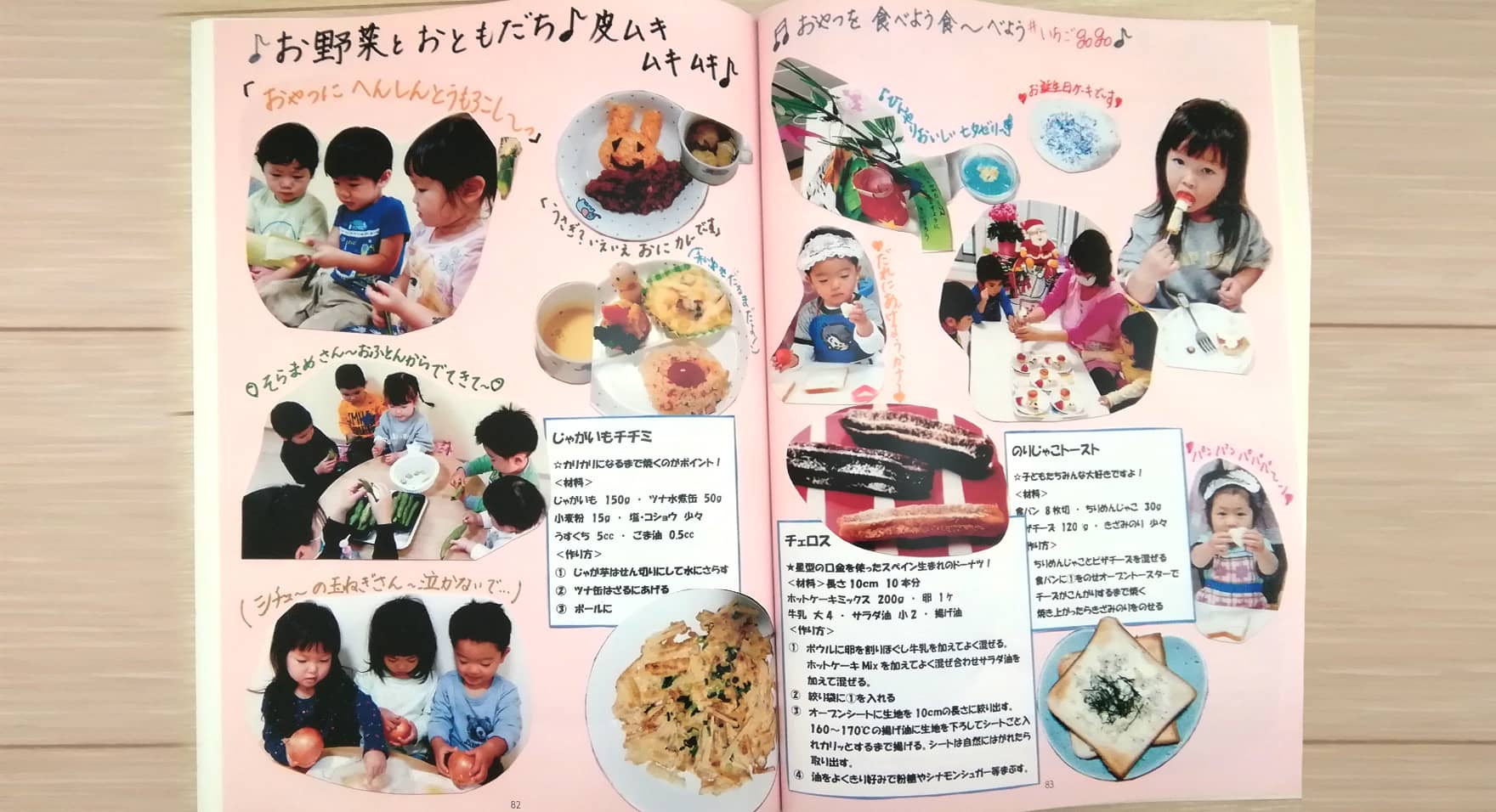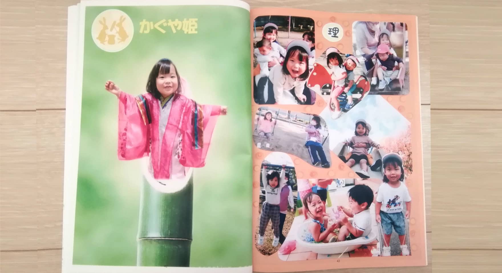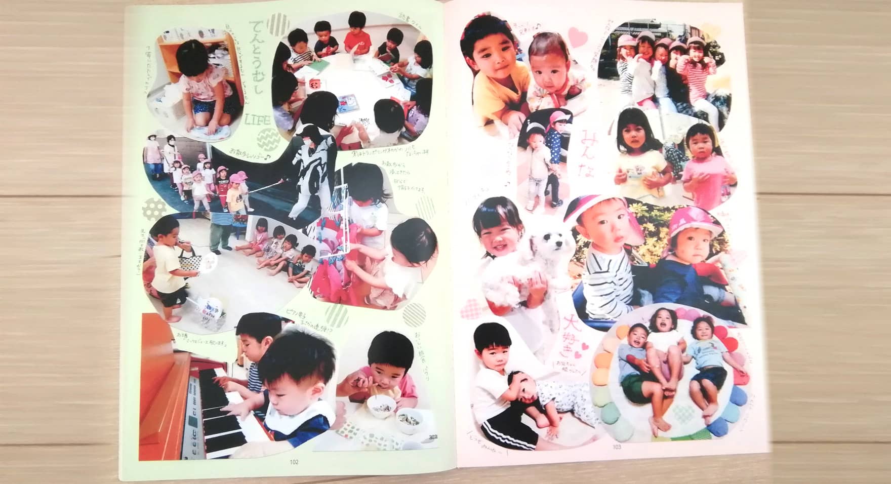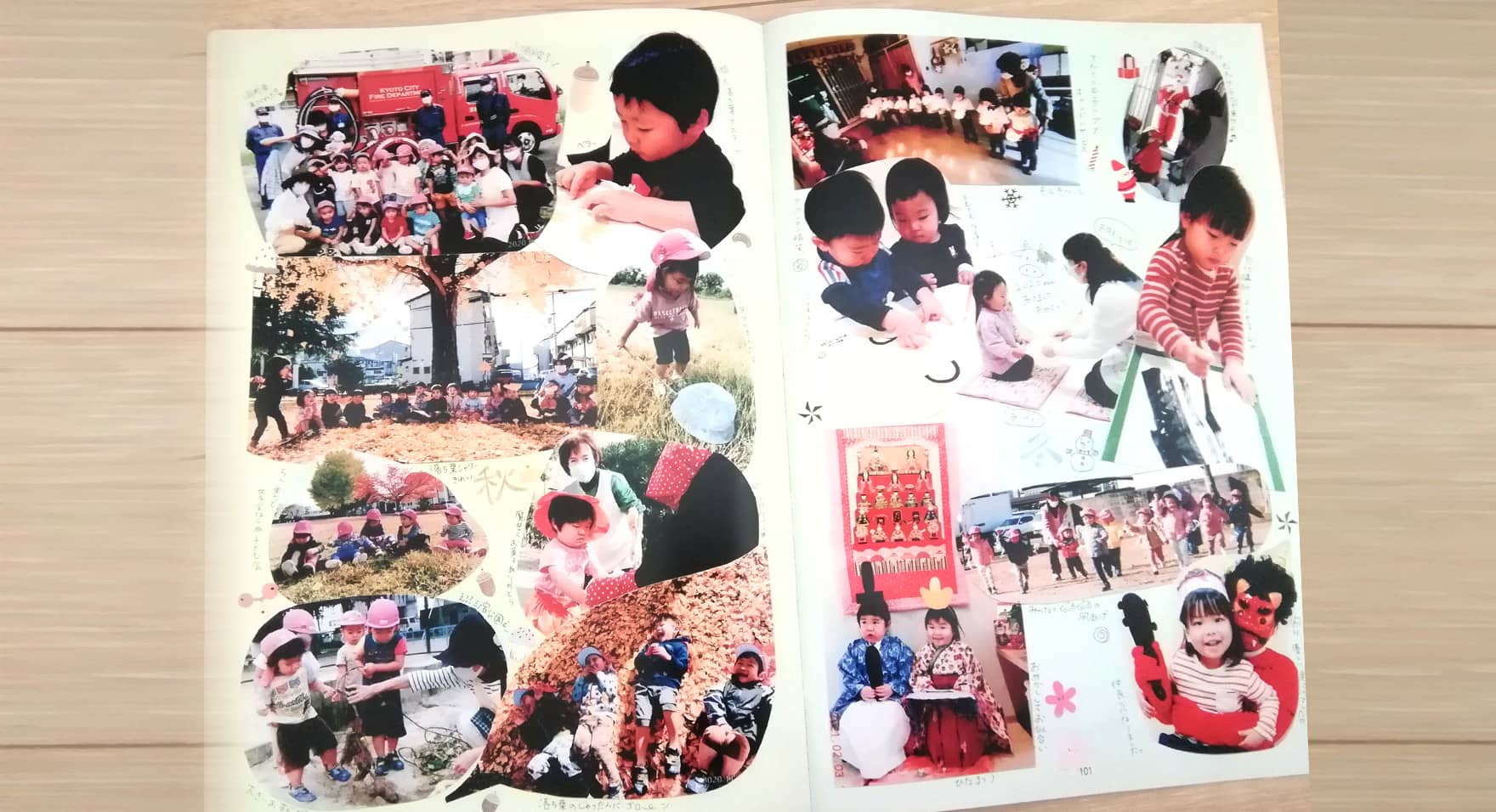ひとり一人のページも多く、春夏秋冬の思い出や保育の様子がしっかりと掲載され、保護者や保育者の企画ページも楽しく思いがあふれる、文字通り大人にも子どもにもかけがえのない『宝』です。