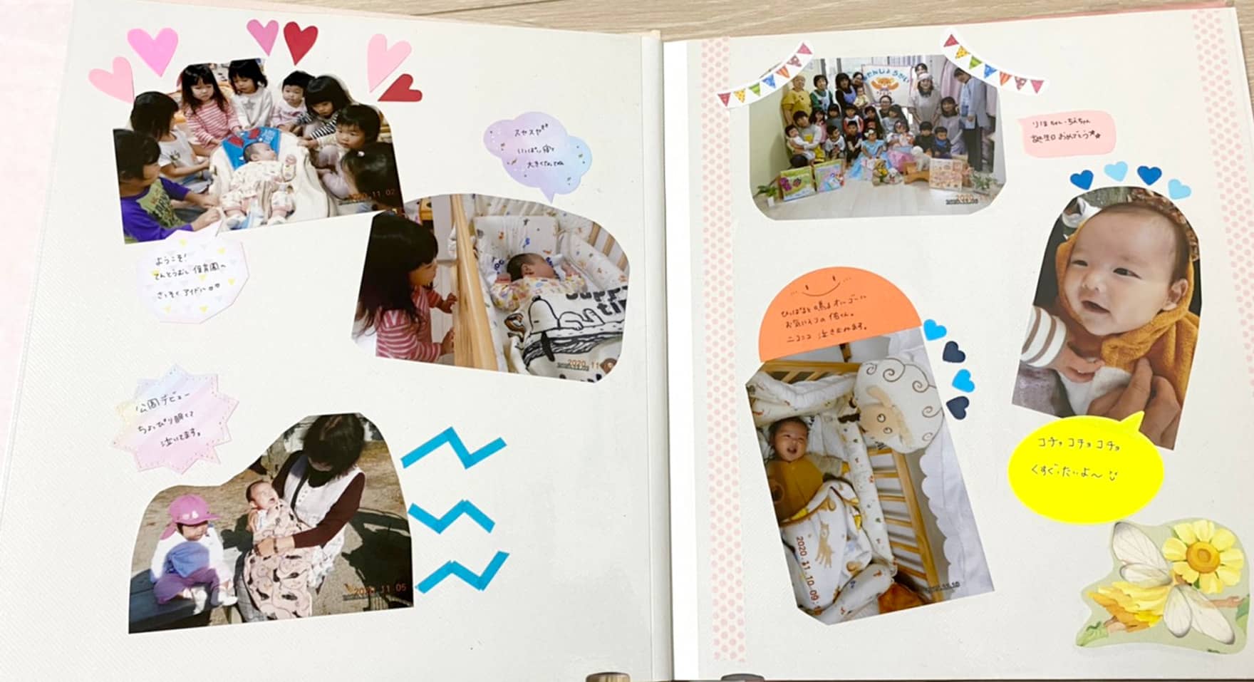 日々保育士が写真やコメントをレイアウトして製作し、卒園時にプレゼントしています。